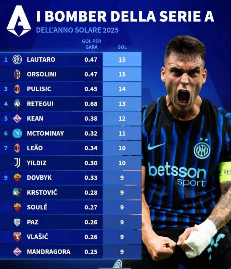 另外,在2025赛季意甲射手榜的排行方面,劳塔罗和奥尔索里尼以15球并列领跑。紧随其后的是普利西奇以14球的成绩稍落一筹,雷特吉和基恩热烈追赶,分别打进13球和12球,显示本赛季的前锋竞争异常激烈。