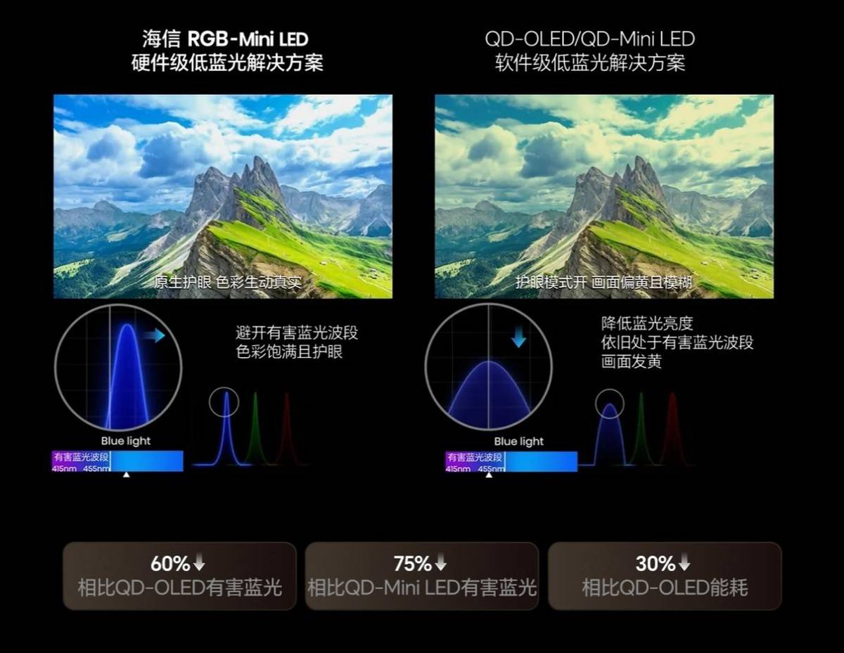 与此同时,海信全新一代RGB-Mini LED技术实现了有害蓝光比QD-OLED降低60%,比传统QD-Mini LED降低75%,能耗降低30%,在拥有极致画质的同时,让护眼与节能终可两者兼得。